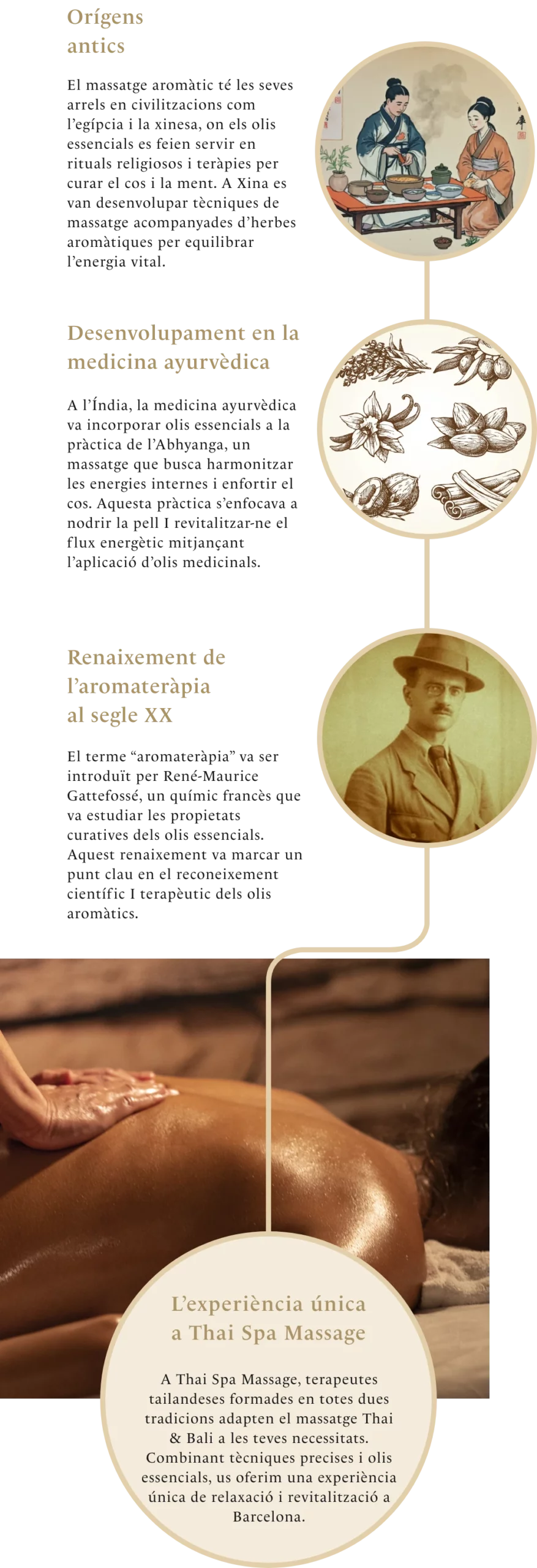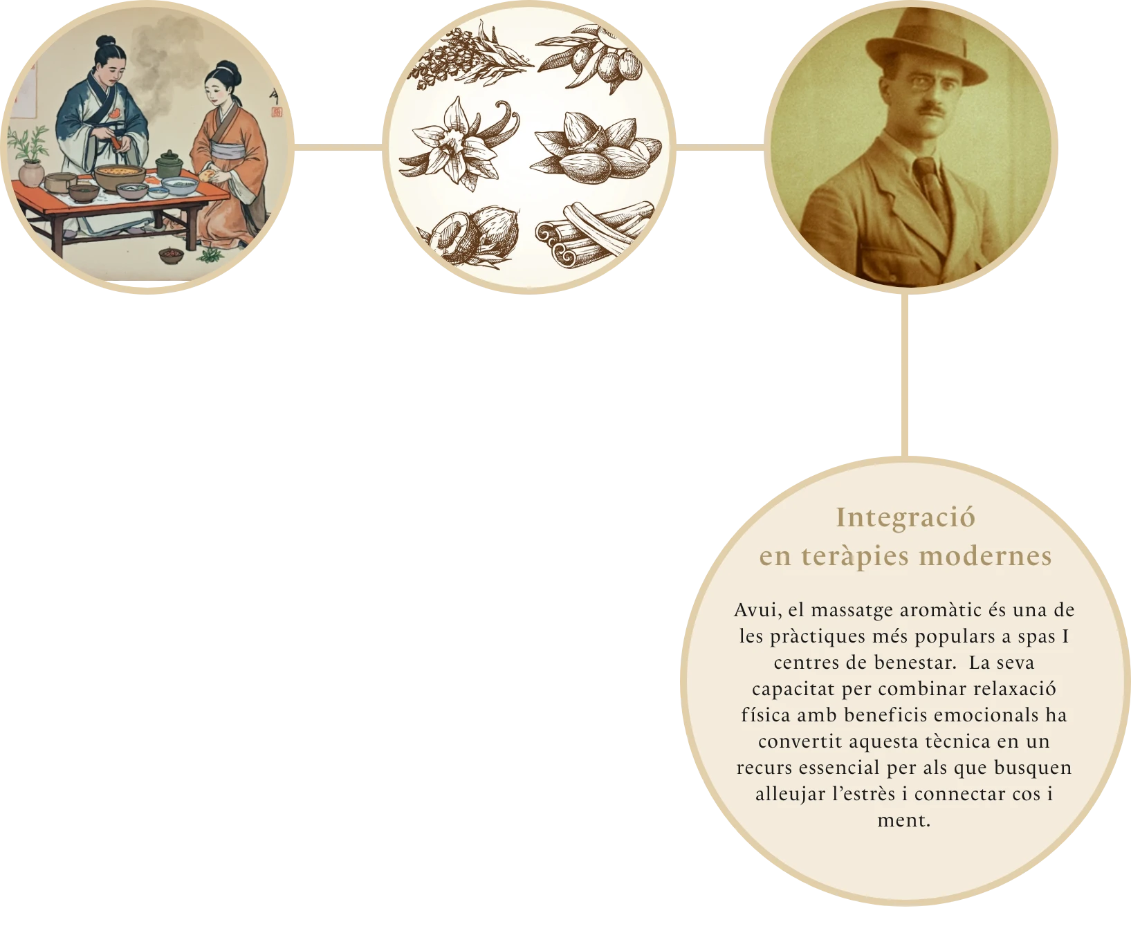 arrels en civilitzacions com l’egípcia i la xinesa, on els olis essencials es feien servir en rituals religiosos i teràpies per curar el cos i la ment. A Xina es van desenvolupar tècniques de massatge acompanyades d’herbes aromàtiques per equilibrar l’energia vital.